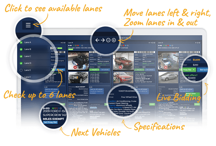 Check up to 6 lanes and have them all displayed on a single screen for multilane participation, rapid bidding, and live streaming. Click control buttons to manipulate lanes at your discretion.
